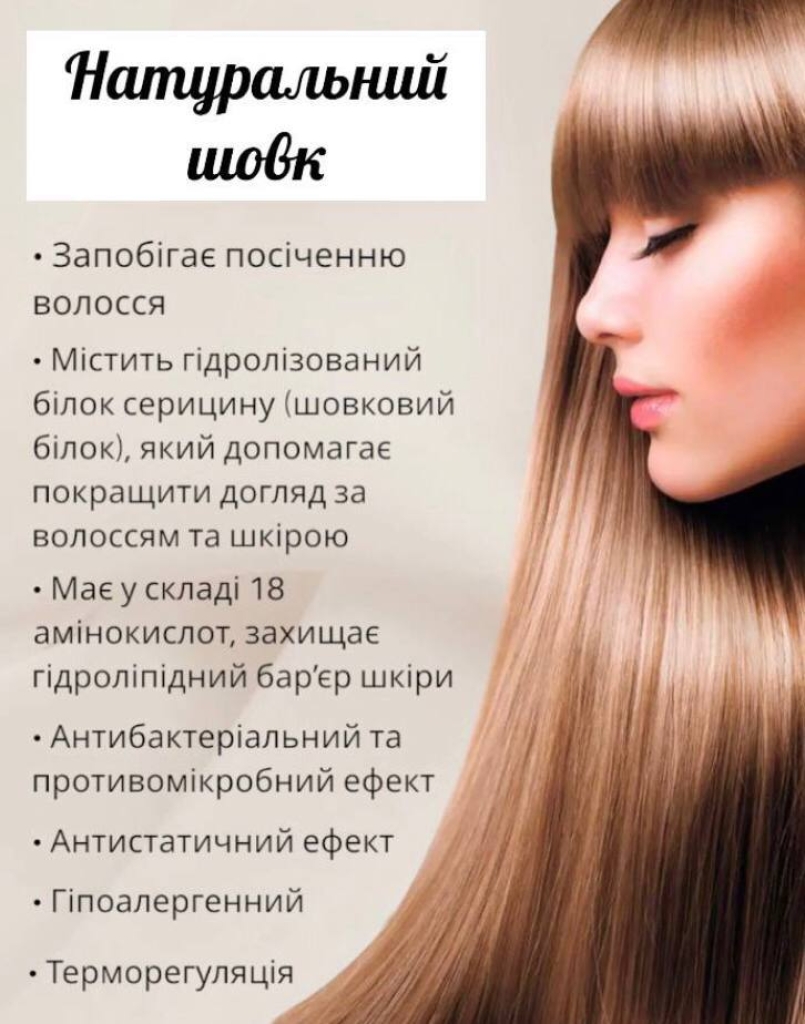 Розкішний догляд за вашим волоссям та шкірою! Шовк запобігає посіченню кінчиків волосся, не травмує її під час сну, тому що мінімізується треття волосся об тканину. Завдяки цьому волосся залишається блискучим та гладеньким.